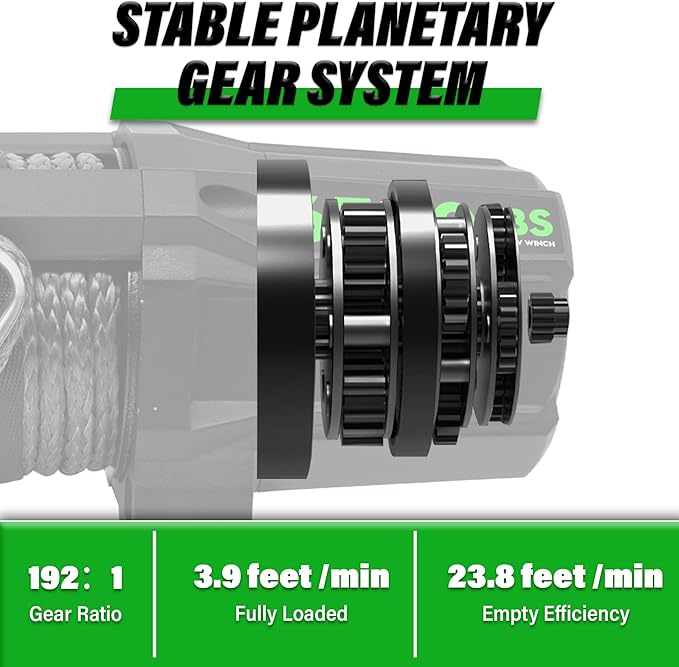 - 【Precision Gears】UTV winch with three-stage planetary gear system,the transmission ratio is 192:1, which not only provides greater torque for the winch, but also saves the size of the gearbox, while significantly improving working accuracy and ensuring the smooth operation of the electric winch during work.