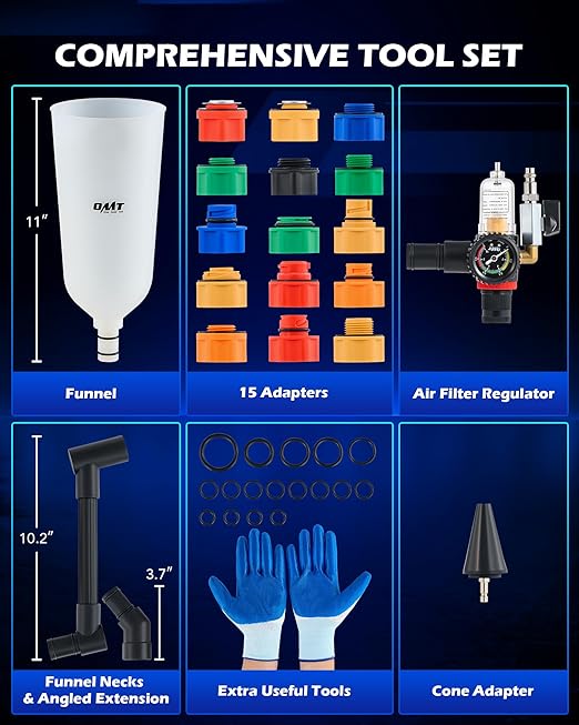 - Wide Compatibility: With 15 adapters to fit most oil tanks and an EU pneumatic connector, our oil filler funnel kit is compatible with a wide variety of vehicles, including Toyota, Ford, Honda, Mazda, Chevy, Jeep, GMC, BMW, Audi, Dodge, and more