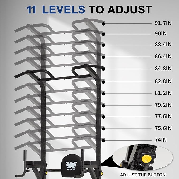 - 【Designed For Comfort】 The pull up dip station has 11 adjustable heights, from 74 "to 91.7". There are also 3D backrest pads that can be adjusted up and down to the left and right, which can closely fit different body curves and provide accurate support for the lower back. It can be easily adjusted to meet the fitness needs of the whole family and realize a new model of family fitness sharing.