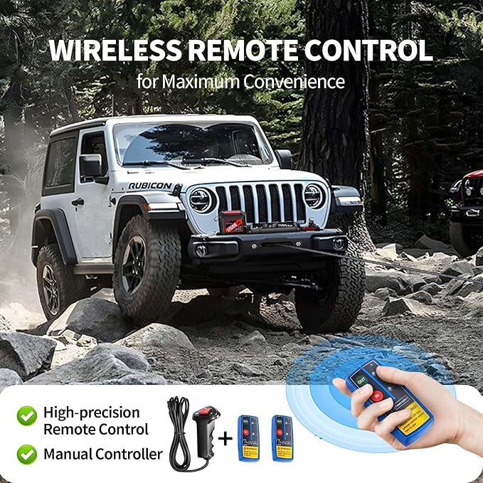 - Wireless and Corded Control: Enjoy the convenience of both wireless handheld remote control and corded control options. Whether you prefer the freedom of wireless operation or the reliability of a corded connection, this winch has you covered. The remote control has a control range of up to 30 meters, allowing you to operate the winch from a safe distance, providing added convenience and safety