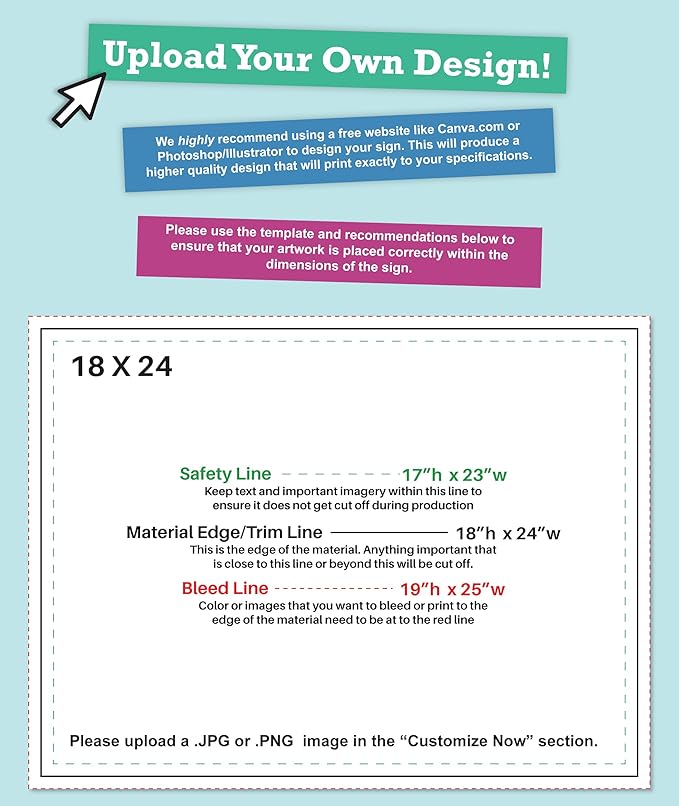 - IMPORTANT: Signs can only be printed in landscape (horizontal) orientation. Orders received with artwork rotated to print in vertical orientation will be canceled as these will not be compatible with the included wire stakes.