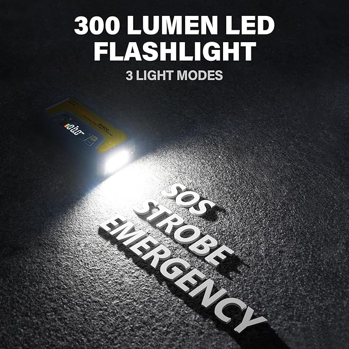 - Emergency Light & Power Supply: In addition to the battery jumper starter portable air compressor, it also can be serve as power supply and LED light. Dual USB port charging for phone, laptop, camera, watch and other mobile devices. 300 lumen LED light support 3 lighting modes: flashlight, strobe and SOS. light time lasting 12hours. Perfect for night road emergencies outdoor adventures.