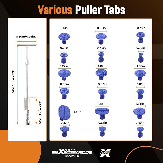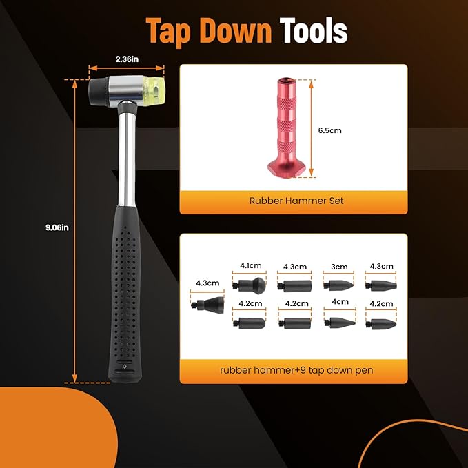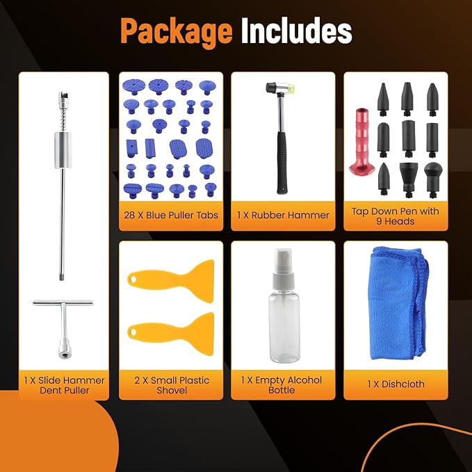 - 【Package Include】1 slide hammer T-bar dent puller, 9 metal tap down pen, 1 rubber hammer, 2 small plastic shovel, 28 blue puller tabs, 1 dishcloth, 1 empty alcohol bottle