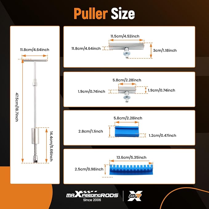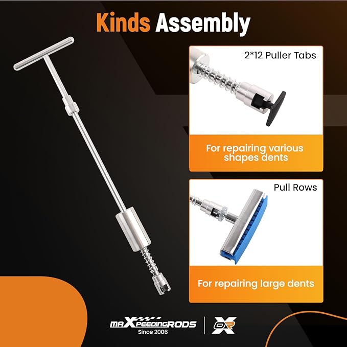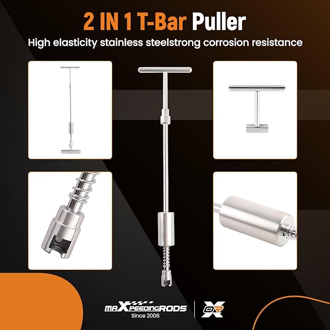 - 【Paintless Repair】The 2 in 1 T-bar dent puller is made of tempered high-carbon stainless steel, in the parts of the body contact with high-quality rubber precision package, which protect the original paint from damaging, even the rubber hammer suitable for uneven dents has a good rubber package