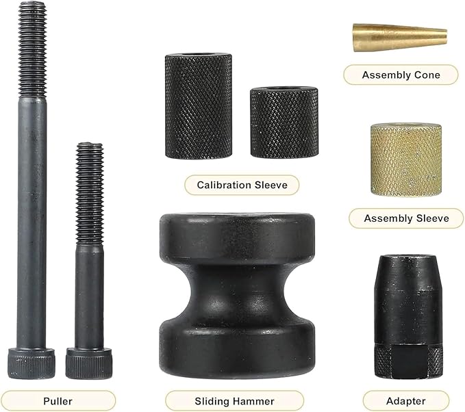 - 【Package】Injector puller & injector seal installer tool Includes 2 x Pullers, 2 x Calibration Sleeves, 1 x Sliding Hammer, 1 x Adapter, 1 x Assembly Cone & 1 x Assembly Sleeve. This tools set can be assembled as an injector puller for pulling and removing injectors. Please check professional video if use it in doubt.
