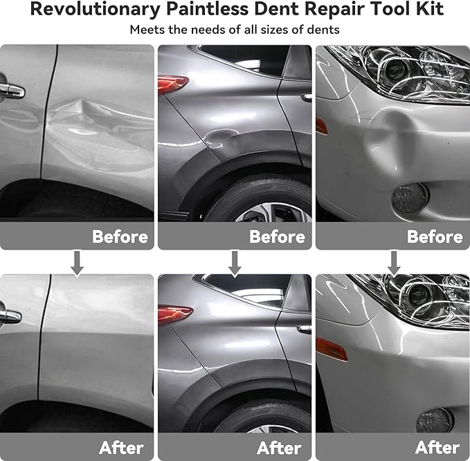 - WIDELY APPLICABLE SCENARIOS - This auto dent puller kit with a wide range of repair functions. This car dent removal kit can effectively repair dents on various metal surfaces found on car doors, refrigerators, motorcycles, washing machines, and more. It also can be used as a door ding repair kit and hail dent removal kit. The car dent repair tool is easy to operate, and most dents can be removed within 30 minutes. Dent repair puller are an economical alternative