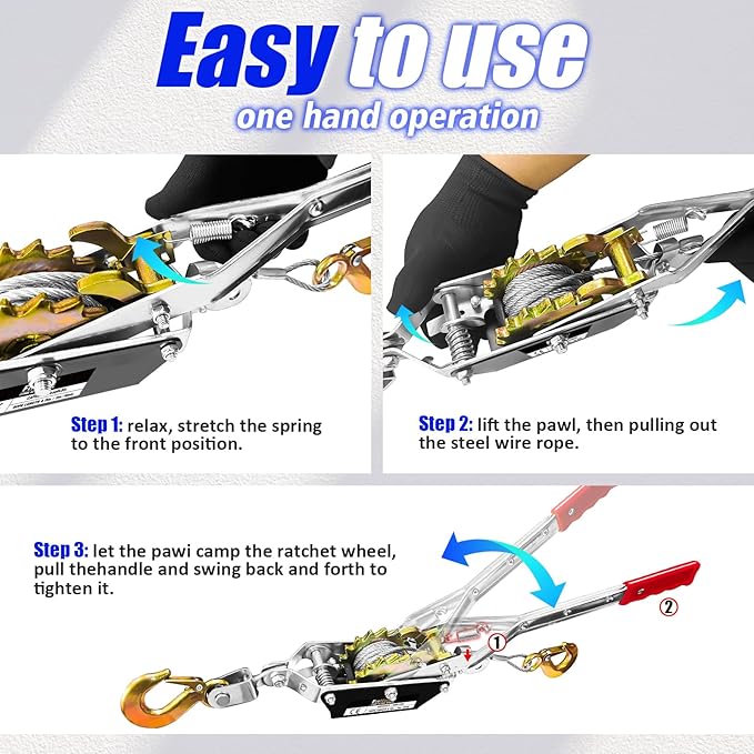 - 【Load Capacity】: 1 Ton heavy duty dual gear come along winch power puller designed with fine-designed, hardened heavy duty steel construction gives you 2240 lbs of maximum pulling power and with two ratchets, two anti release hooks automotive hoist cable puller. Powerful ratcheting system, making it a powerful tool for various applications, excellent for pulling heavy-duty loads.