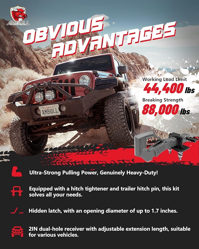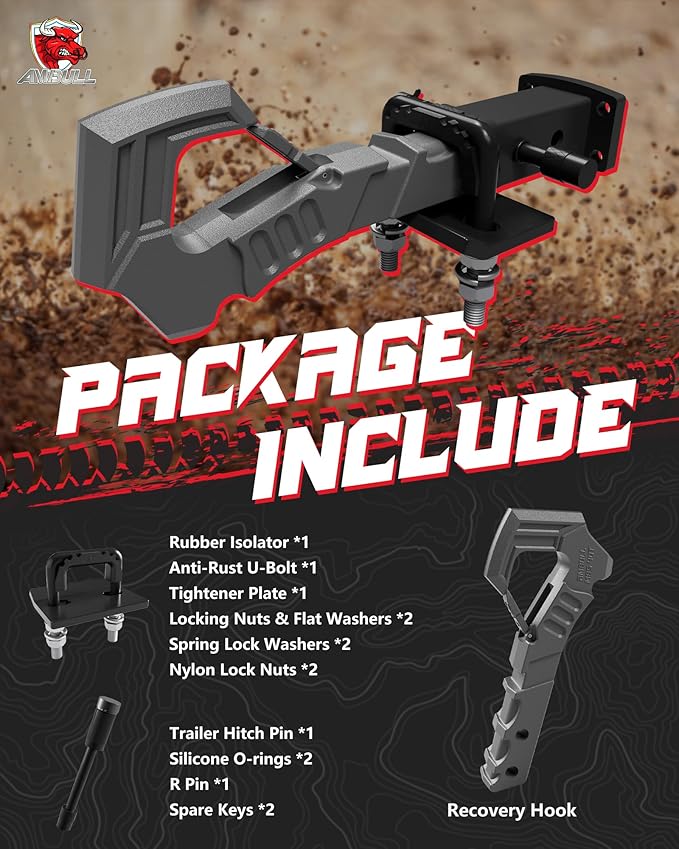 - MATERIAL: AMBULL Tow Hitch Receiver Hook with Hitch Tightener and Trailer Hitch Pin is made of heavy-duty drop forged steel. It is zinc-plated and powder-coated for enhanced durability, capable of withstanding extreme weather conditions