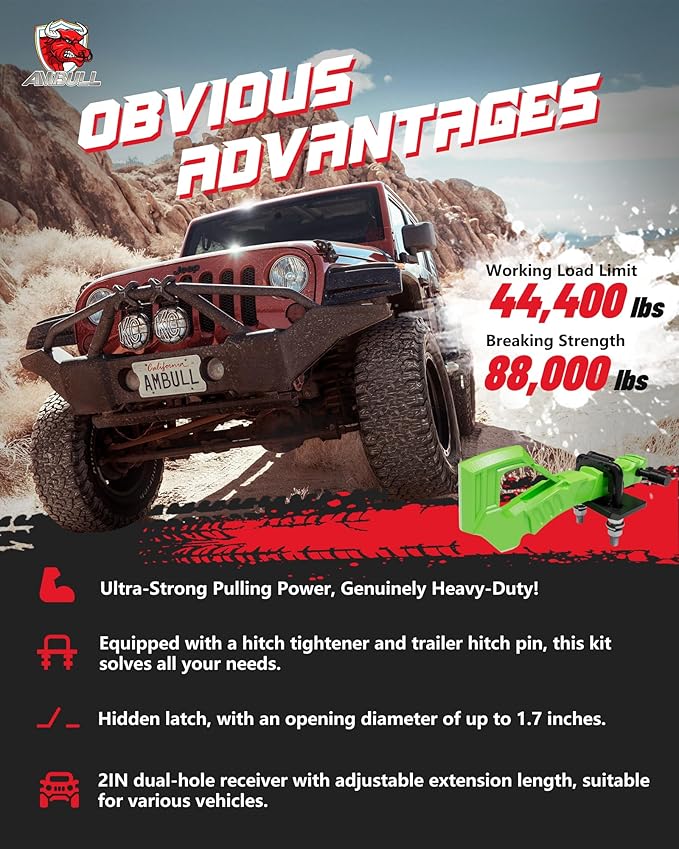 - MATERIAL: AMBULL Tow Hitch Receiver Hook with Hitch Tightener and Trailer Hitch Pin is made of heavy-duty drop forged steel. It is zinc-plated and powder-coated for enhanced durability, capable of withstanding extreme weather conditions