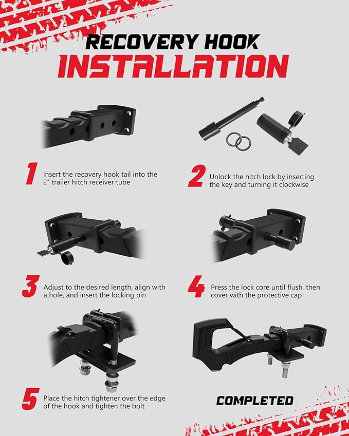 - APPLICATION: This tow hook is not only suitable for truck hitch but also for hardline off-road vehicles, trailers, SUVs, ATVs, UTVs, and other vehicles with a 2-inch receiver tube. We have provided an extended trailer lock to fit more vehicles. Please confirm that the lock length is suitable for yours