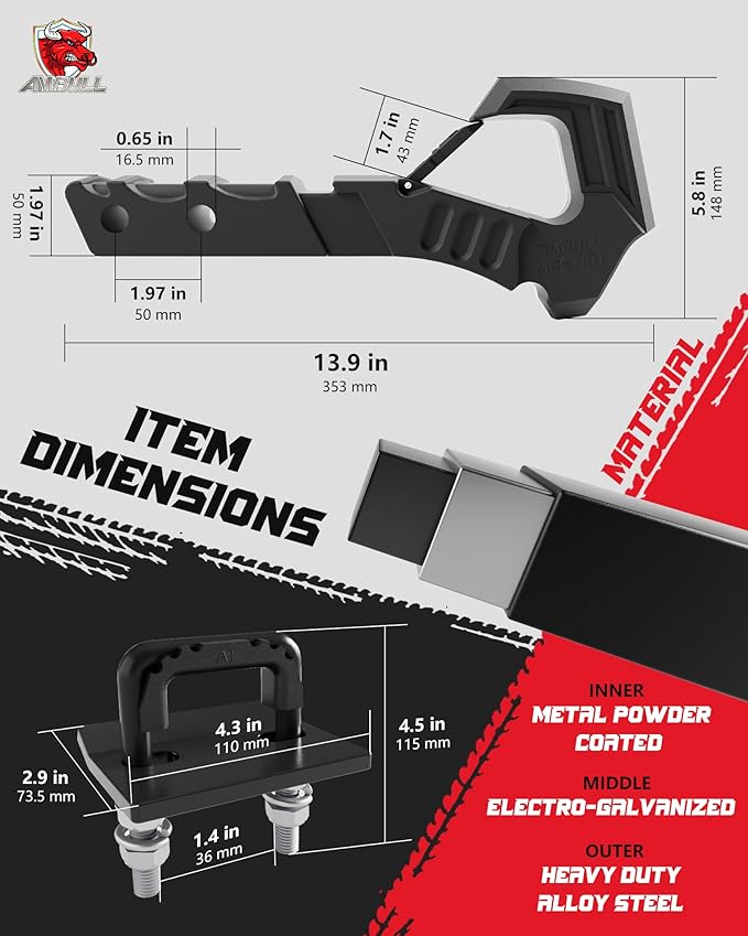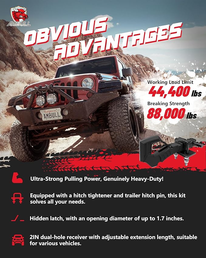 - MATERIAL: AMBULL Tow Hitch Receiver Hook with Hitch Tightener and Trailer Hitch Pin is made of heavy-duty drop forged steel. It is zinc-plated and powder-coated for enhanced durability, capable of withstanding extreme weather conditions