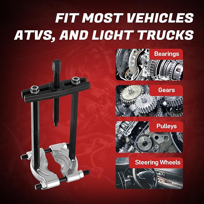 - 【SUPERIOR VERSATILE】 Our bearing separator set Includes 2-piece bearing separator jaws for most small and large wheel bearings and gears. The 8-piece push-pull legs and extension legs fit most shafts of different length. This tool set is ideal for pulling gears, pulleys, bearings, axle shafts, pinion, steering wheels on cars, vehicles, ATVs, and light trucks.