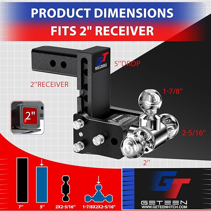 Geteen Trailer Hitches, Adjustable Trailer Hitch Ball Mount - Fits 2" Receiver, Tri-Ball (1-7/8" x 2" x 2-5/16"), 5" Drop, 10,000 GTW - GT20053B