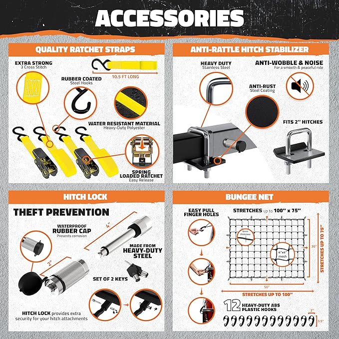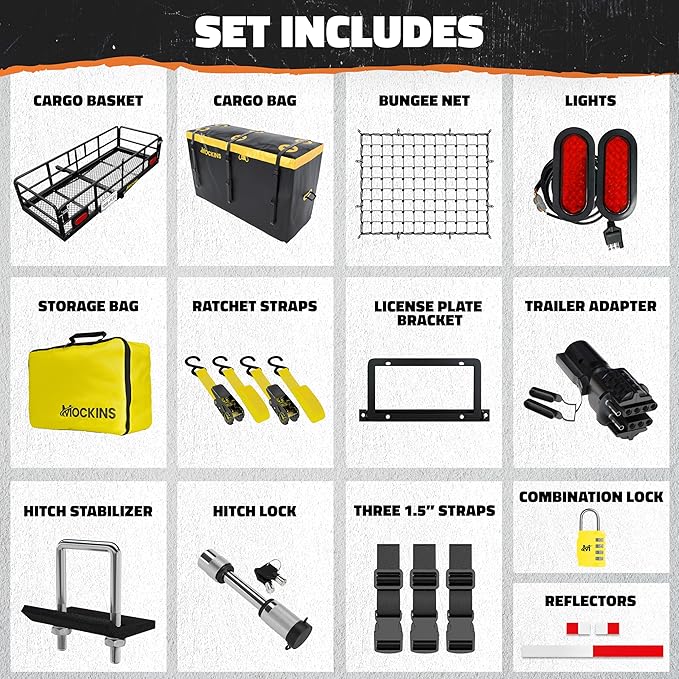 - FOLDING HITCH CARGO CARRIER BUNDLE: Get all you need for easy hauling—a 500 lbs. capacity high rail rear cargo carrier for SUV & car, complete with a hitch lock, stabilizer, & reflectors. Also included is a waterproof cargo hitch rack bag with a combo lock & storage case. Keep your gear secure using hitch hauler accessories: 3 buckle straps, 2 ratchet straps, a 6mm thick cargo net, a license plate bracket & rear signal lights. Upgrade your hauling with the Mockins Trailer Hitch Storage Rack !