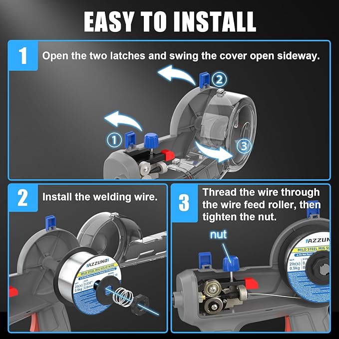 - 【Packing List】: AZZUNO Handheld MIG Welder×1, .030"/1lb Flux Core Wire×1, Contact Tip×2, .035" K Groove Drive Roller×1, Ground Clamp×1, Brush & Hammer×1, User Manual×1.