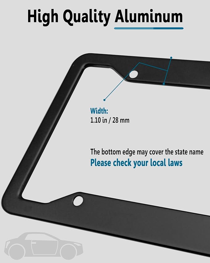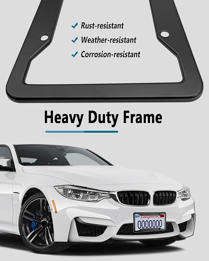 - License Plate Frame Black- Matte black aluminum metal license plate holder, Heavy duty frame, durable, corrosion-resistant, rust-resistant, weather-resistant, and fade-resistant. Lasting as new after using for a long time. Comes in 2 pack, suitable for front bumper and rear license plate holder. 4 hole frame can install firmly