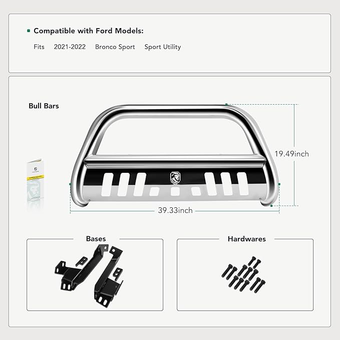 - Verified Fitment: 3" Bull Bar compatible with Ford Bronco Sport 2021-2022 Sport Utility. Installation may interfere with bumper mounted parking sensor & camera