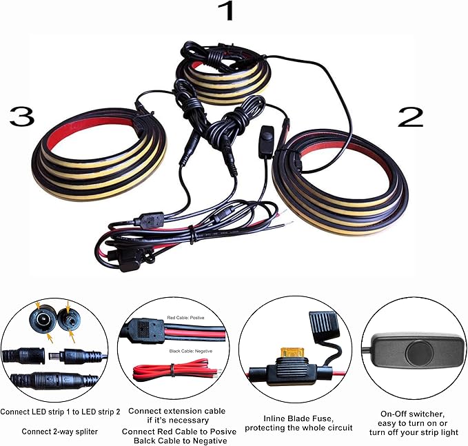 - [ Safe Electrical Connection ]: Comes with splitter cable, blade fuse, on/off switch and mounting hardwares. Always ensure circuit safety while you're on the road.