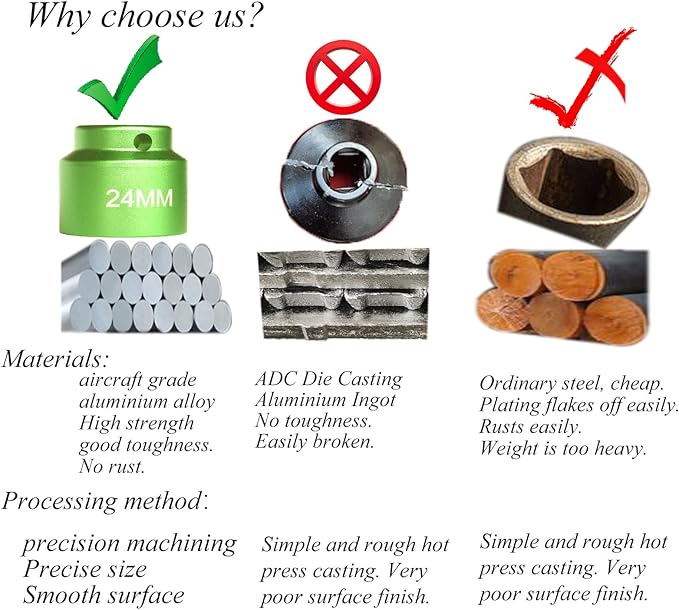 - 24mm oil filter socket use 6061 aerospace grade aluminium alloy material, precision CNC machined to exact dimensions to avoid corners on the air filter cover. The 6 faces in contact with the filter are wide and fit well. The surface is sandblasted anodised, smooth and delicate. Light weight, high toughness, good strength. Never rust.