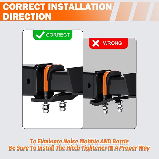 - HOW TO USE: The hitch tightener 2 inch is easy to use and set up. After connecting the trailer receiver, simply lock the U-bolt and tighten plate, then install the flat washer, locking nut, and spring locking washer in sequence. Finally, use the included wrench to tighten the nylon locking nut. If the hitch is low and the U-bolt may scratch the ground, then lock the tightner from the bottom