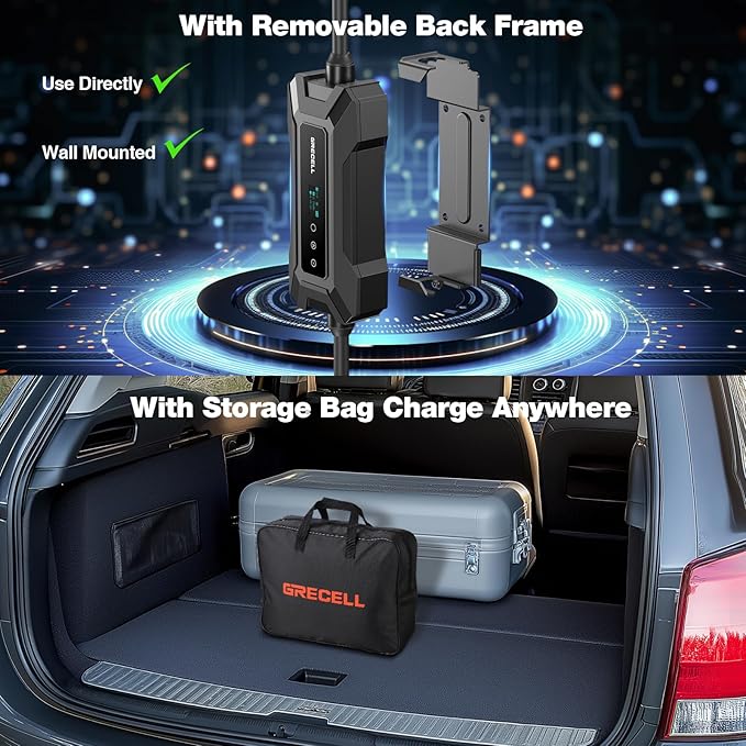 - 【Convenient to Store & Carry】 Easily carry and store your Tesla mobile charger with the included storage bag. It comes with pylons and a gun holder for optional wall mounting or use directly. GRECELL provides 24-month support and friendly customer service