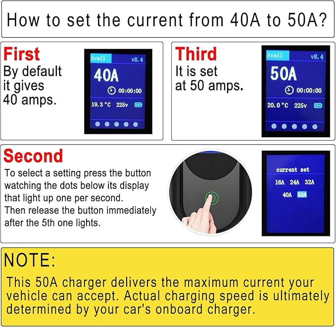 - 【50% Faster Charging Speed than 32A】This EV Charger is SubSun's fastest charging device. It supports up to 50A Level 2 fast charging, provides a charging rate of 44 miles per hour(Different car models result in different miles). The max power is 11.5kw. Based on the Chevy Blot EV with a 65 degree battery, charging from 0% to 50% takes 3 hours. The next morning, go out with a full battery. This 50A model is very suitable for people who don't want to wait for a long time. The first display by default is 40Amp. It needs to be manually adjusted to the 50A gear.