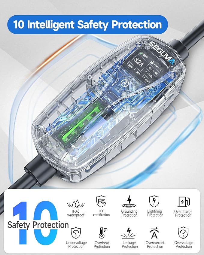 - Universal Compatibility: Seguma 32A J1772 level 2 charger is engineered with standardized J1772 connector, works flawlessly with any electric vehicle featuring a j1772 charging port. Whether you drive a Ford, Kia, Bolt, or any other EV model, this portable ev charger ensures hassle-free charging every time