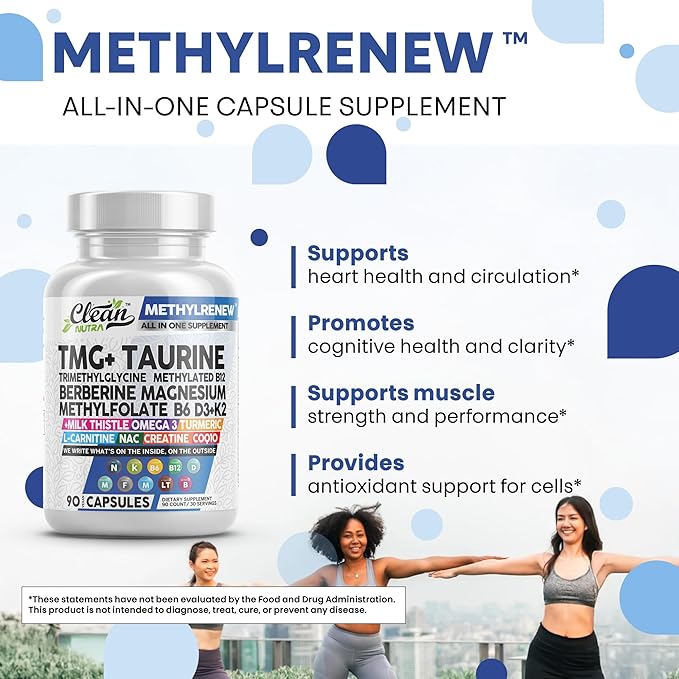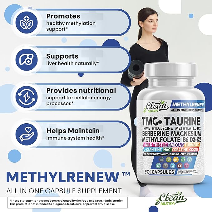 Clean Nutra Methylated Multivitamin for Women Men TMG Taurine Supplement + B6 Vitamins, B12, D3 K2, Magnesium Methylfolate Milk Thistle Omega 3 Turmeric NAC L Carnitine Creatine COQ10 B Complex Caps