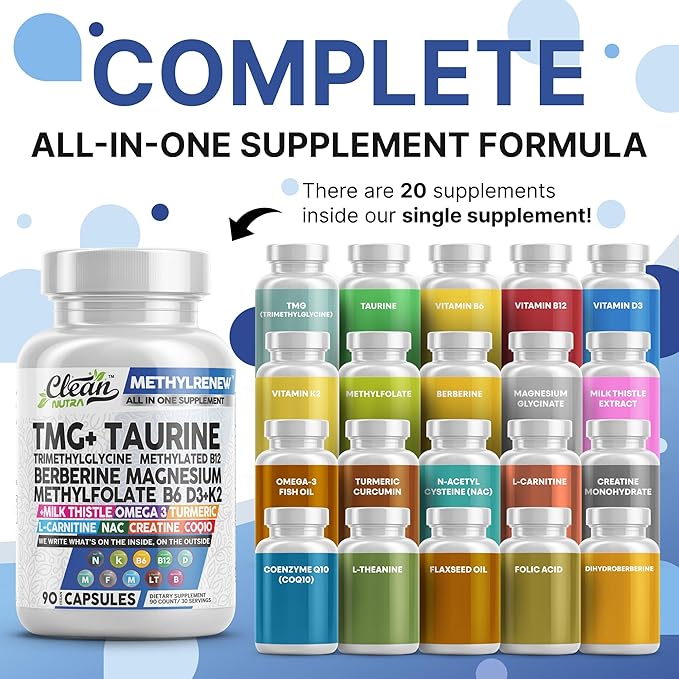 - All In One TMG Supplement Methylated Multivitamin : A powerful combination of TMG supplements, Taurine supplement, vitamin B12, and B complex vitamins for women and men to support methylation pathways for overall health. The formula also incorporates Fish Oil Omega 3 supplements, Turmeric supplement, Milk of Magnesia, CoQ10 100mg and Nac supplement for added nutritional support. Experience optimal absorption of these nutrients for gut health for women and men with addition of vitamin k2 and amino acids supplement.