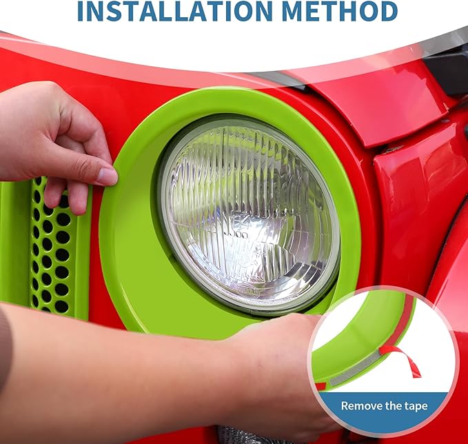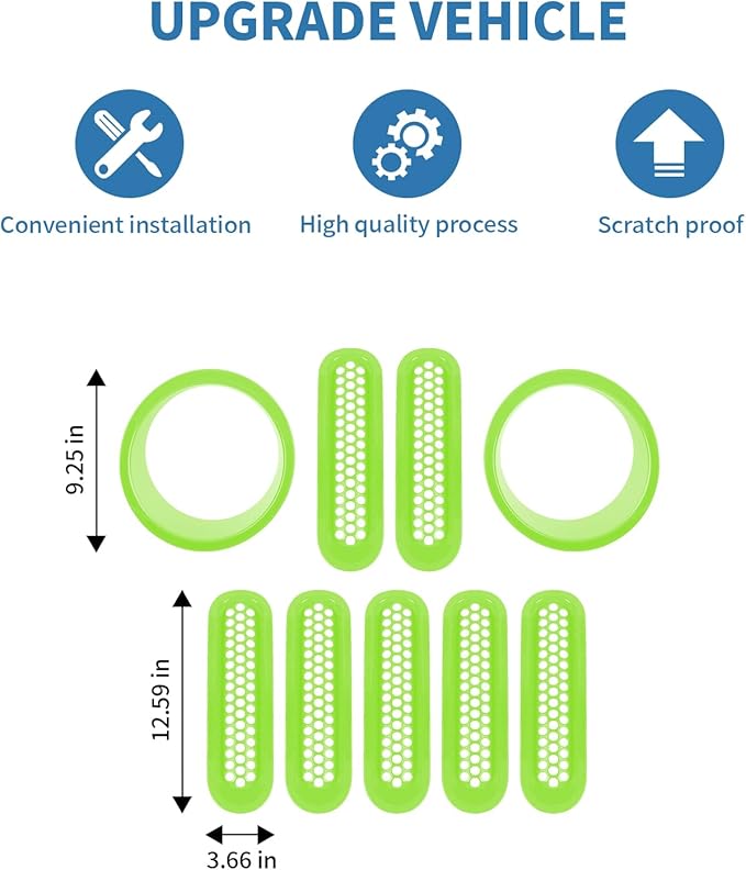 - 【HIGH QUALITY】 PDKLIN for Wrangler JK Green Front Grille Inserts & Headlight Cover Trim Ring made of high-quality ABS plastic and used polish process for deformation protection, anti-corrosion, and years of trouble-free use