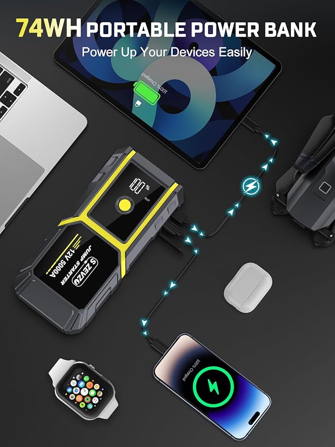 - 74Wh Portable Power Bank: This portable jump box also has a battery capacity of 74Wh that can be used as a backup power bank to charge your phones, tablets, and other USB port digital devices. It is designed with two USB outputs (5V/3A) and (5V/2.1A) that can be applied simultaneously for charging, 50% faster than a standard charger.