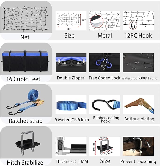 - ACCESSORY INCLUDED - Waterproof Cargo Bag 16 Cubic Feet (58x19x24 Inch), Hitch Stabilizer, Cargo net with attachment hooks, Ratchet Straps.
