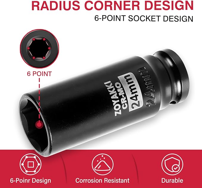 - 6-point design: This impact socket set features a 6-point high-torque design, ensuring strong contact and secure grip with the flat sides of nuts or bolt heads, rather than the weaker corners, effectively preventing thread wear, whether using an impact wrench or manual operation