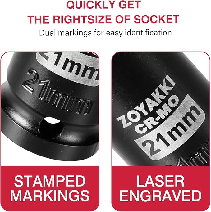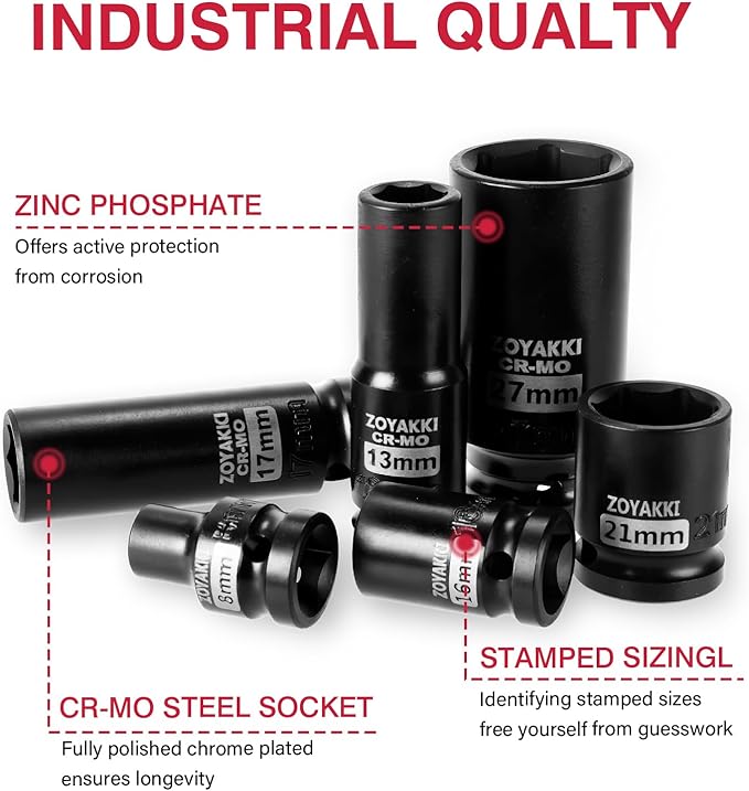 - ZOYAKKI Set Includes: 35-piece 1/2-inch drive Deep impact sockets: 10-12-13-14-15-16-17-18-19-21-22-24-27-30-32mm; & Standard impact sockets:8-9-10-11-12-13-14-15-16-17-18-19-20-21-22-23-24-27-30-32mm, 35PC,1-piece Storage case.