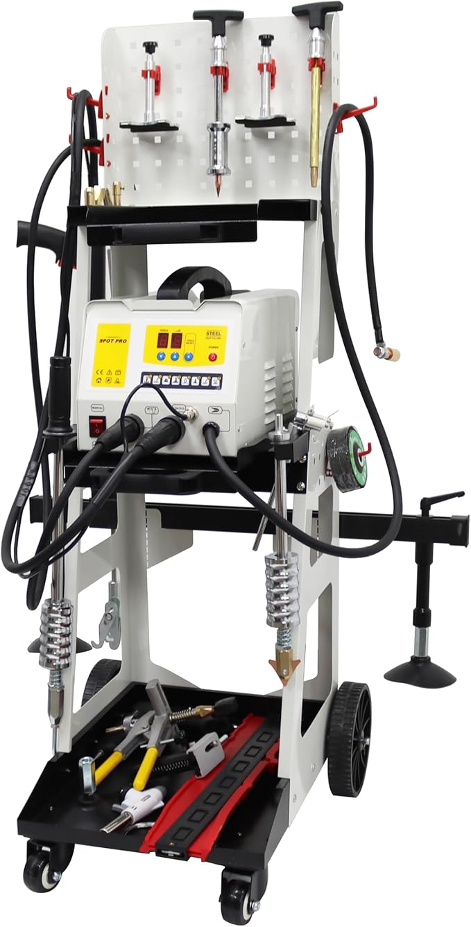 - 【For steel】A spot welder for steel car is included. Welding guns, aluminium pulling rack, heat gun and other repairing tools such as pot welding pulling hammer, multifunctional pulling hammer, quick spot welding tool, file, welding repair tool, fine repair tool, gaskets and etc are included. A shelf with wheels is also included for storage and easy movement. It Is popularly used for dent repair by car repair shops, sheet metal repair shops.