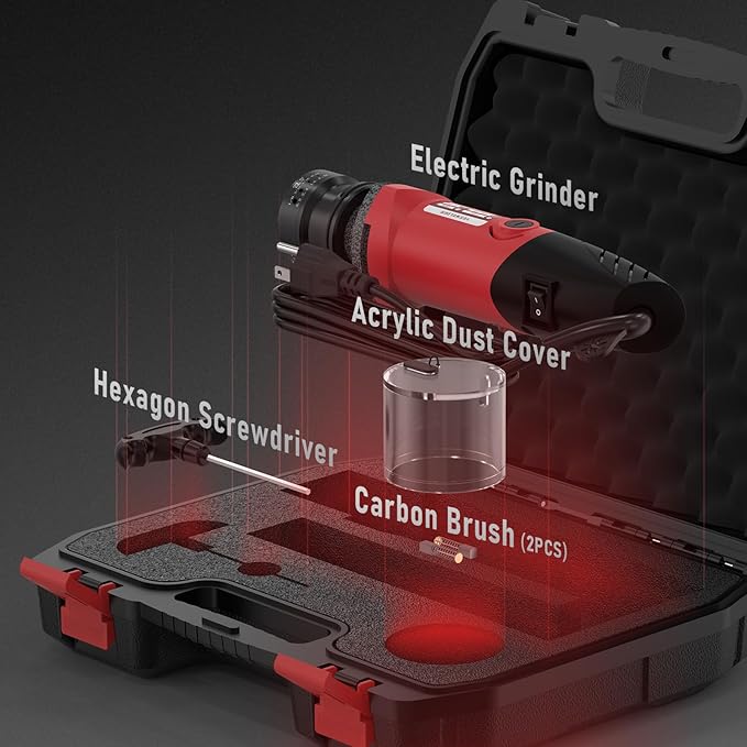 - Package Include: Electric Grinder*1, Storage Box*1, Hexagon Screwdriver*1, Acrylic Dust Cover*1, Carbon Brush*2