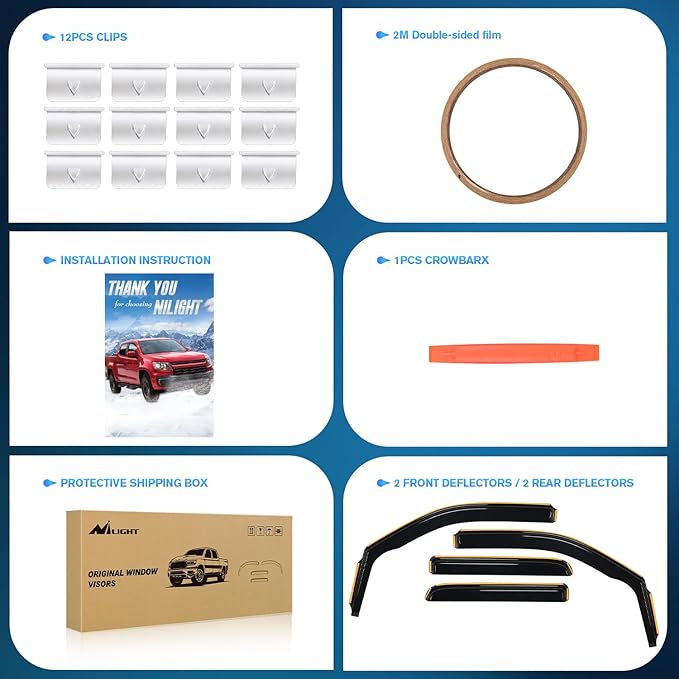 - PACKAGE INCLUDED:4 PCS Rain Guards,12pcs clips,Crowbar 1pcs,78inch double-sided tape and installation instruction