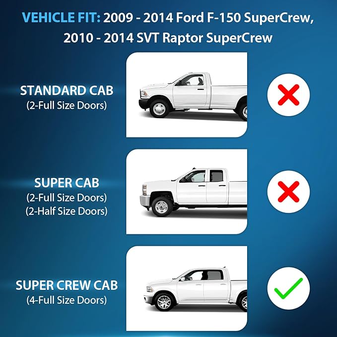 - FITMENT:2009 - 2014 Ford F150 Super Crew, 2010-2014 F150 SVT Raptor Super Crew