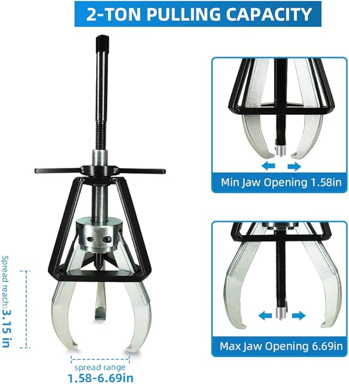 - Specifications : The longest distance from the screw tip to the claw hook: 3.15 inch . Spread Range: 1.58 to 6.69 INCHES . Pull Capacity: 2 Ton.