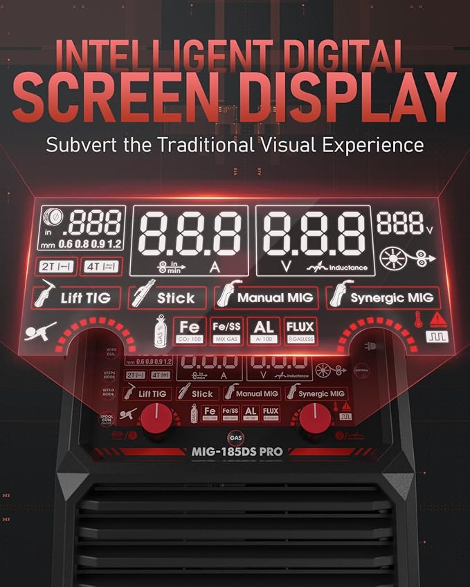 YESWELDER 185A MIG Welder, Flux Core MIG/Gas MIG/Spool Gun MIG/Lift TIG/Stick 5 in 1 Multi-process Aluminum Welding Machine, LED Digital Display Synergic Control 110V/220V Dual Voltage MIG-185DS PRO
