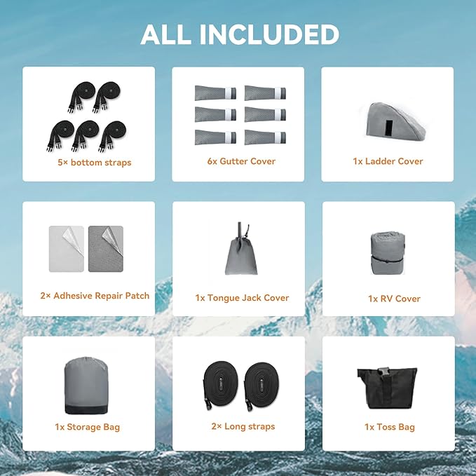 - PACKING LIST & 24-MONTH SUPPORT - 1 * RV Cover; 1 * Storage Bag; 5 * Bottom Strap; 2 * Extra Long Straps; 6 * Gutter Cover; 1 * Ladder Cover; 1 * Tongue Jack Cover; 2 * Adhesive Repair Patch; 1 * Toss Bag; 1 * User Manual. Somokg travel trailer cover is backed by 2-year support. Please rest assured to purchase, we will always provide you with a satisfactory solution for any problem.