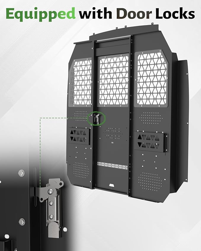 - Quick Access to Items:Van partition bulkhead provides 2 flexible installation options, hinged mounting can freely open or close the middle door panel,no need to go down from the driver's side to quickly access the items in the rear compartment;three bulkheads are fixed mounted to provide greater stability
