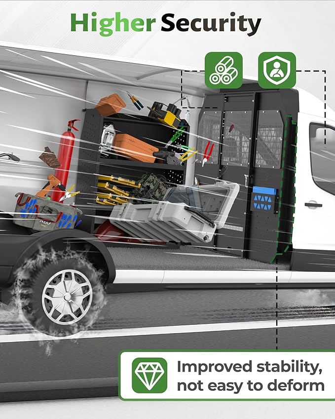 - Higher Safety:The van safety partition for 2015-2023 ford transit 150 250 350 mid-roof full size van is made of heavy-duty steel with unique folded edges to resist large impacts and prevent bulk cargo from shifting into the cab area during travel;providing a solid steel Provides a strong steel barrier to better protect the driver