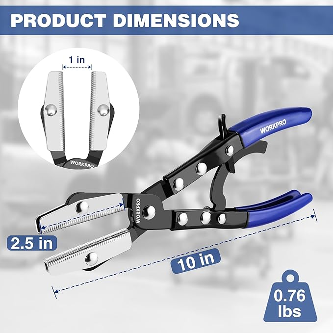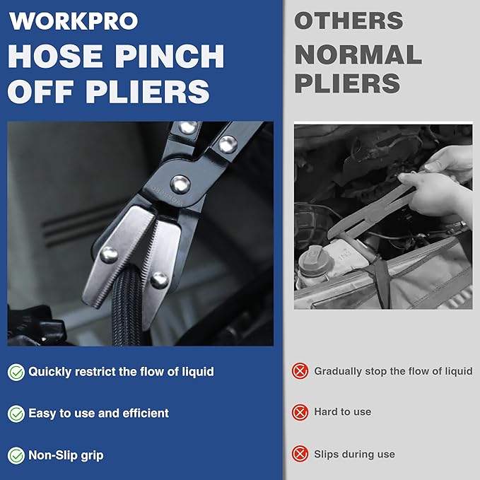 - Professional Quality & Comfortable Grip: Rigorously tested for durability and performance, WORKPRO ratcheting hose pinch off pliers are built to meet professional standards. The ergonomically designed handle ensures a secure, comfortable grip that minimizes hand fatigue, making them a go-to tool for both professionals and automotive enthusiasts
