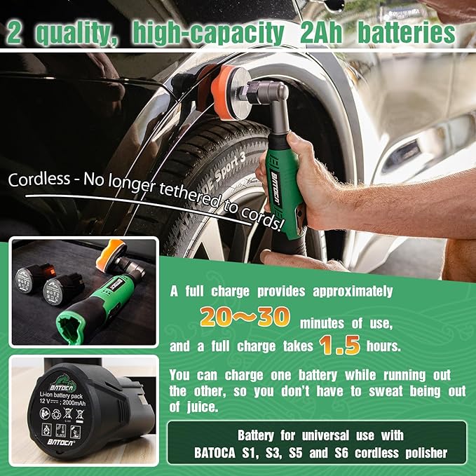 - BATOCA S6 cordless buffer and polisher has a wide range of applications, suitable for larger areas. Like car hoods, doorways, trunks, sides and bumpers of your car, etc.