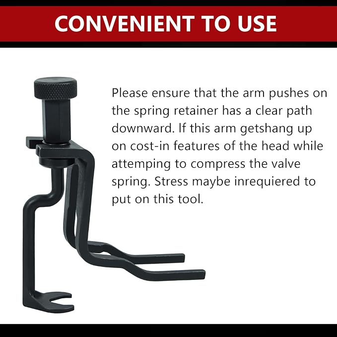 - Useful Functions - Use this tool to replace rocker arms, lash adjusters and other valve components without disassembling the camshaft. Ensure that the rocker arm pushing on the spring seat has a clear downward path. The bevelled design of valve spring compression tool prevents damage to the metal when using the engine spring compression tool, get the job done quickly and safely!