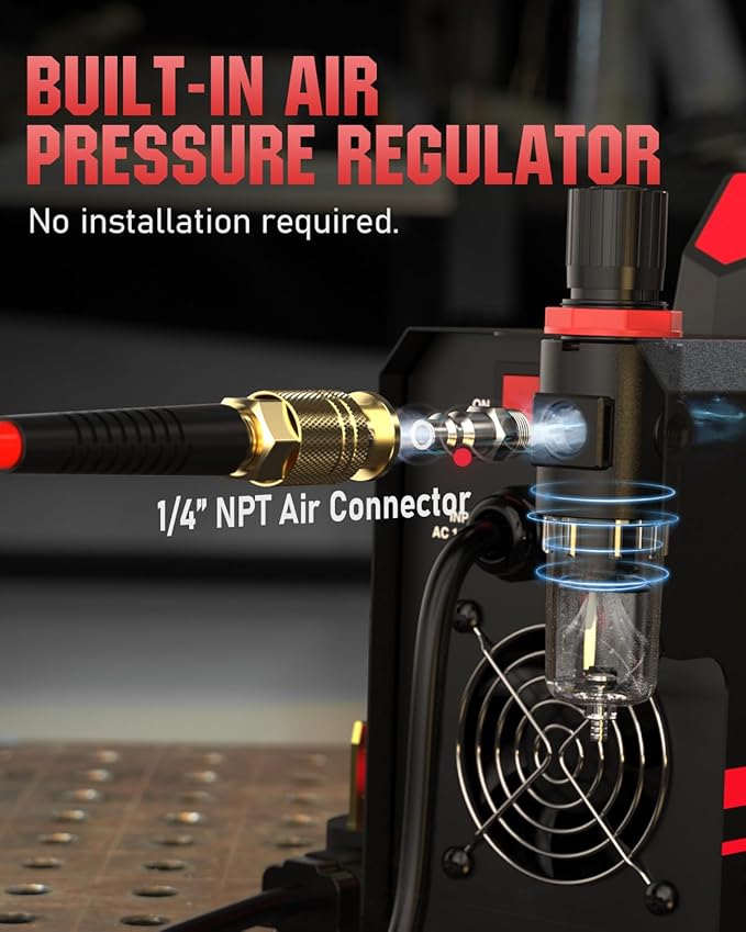 - BUILT-IN AIR FILTER: Strategically positioned at the rear of the machine, the air filter ensures a swift connection. This thoughtful placement not only slashes installation time but also significantly ramps up overall operational efficiency. Regardless of whether the input voltage is 110V or 220V, maintain the air pressure within 45-75 Psi. Failure to do so may adversely affect cutting performance. Note: Requires external air compressor (sold separately).