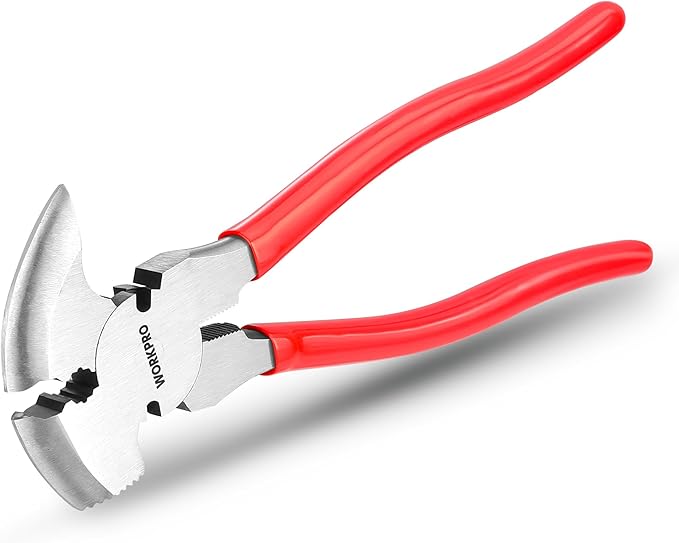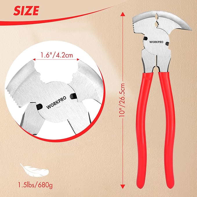 - Versatile Multi-Tool Fence Pliers: The WORKPRO 10-inch fence pliers combine six essential functions in one powerful tool. It is designed for versatility and includes wire cutting, nail pulling, staple removal, gripping, hammering, and twisting capabilities. Whether installing, maintaining, or repairing fences, this all-in-one tool allows you to cut, twist, pull, and hammer without switching between multiple tools