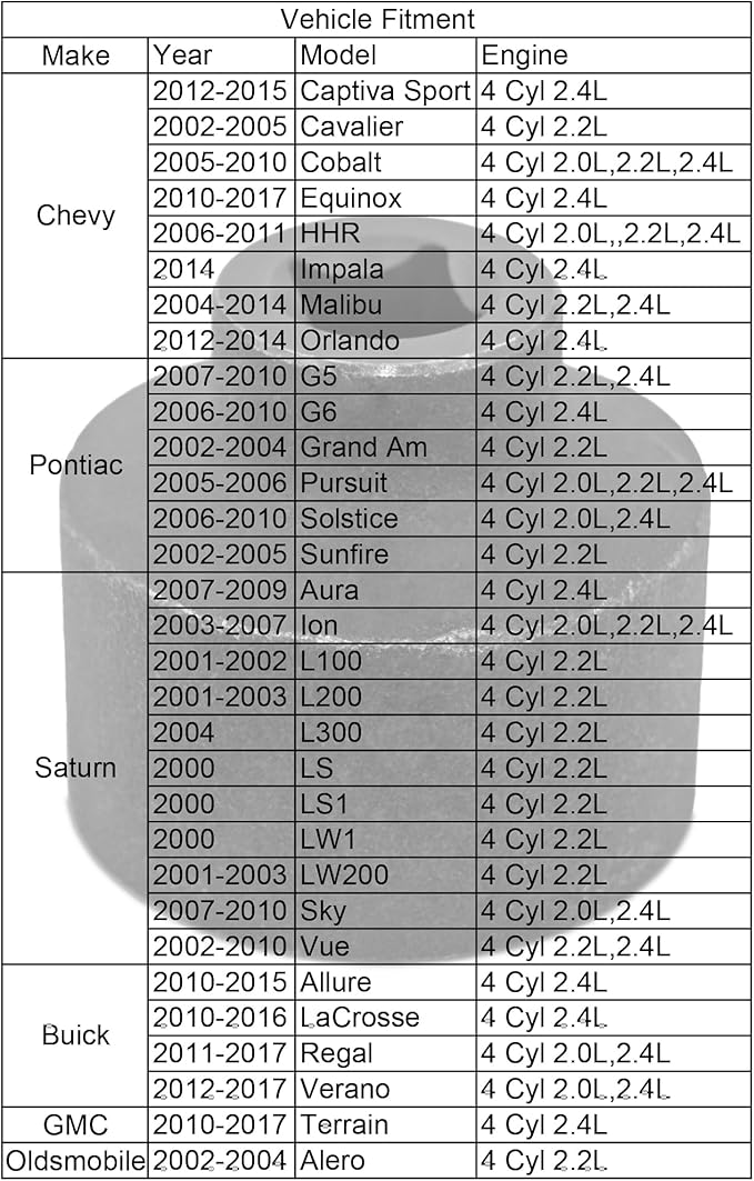 - Fits chevy Cobalt HHR Orlando ALL years, 2002-2015 Captiva Sports, 2002-2005 Cavalier, 2010-2017 Equinox, 2014 Impala, 2004-2014 Orlando with 4 cyl 2.0L 2.2L 2.4L.