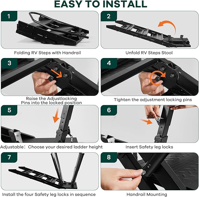 - FOLDABLE RV STEPS DESIGN: FURVSTA RV Steps features a convenient foldable design,and you can install it by yourself without needing any special tools or equipment. When folded, it can be placed against a wall, in a corner, or stowed in a cabinet or car trunk with minimal space usage. Note: Handrail requires separate removal